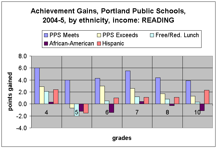 Achievement Gains, Portland Public Schools, 2004-5, by ethnicity, income
