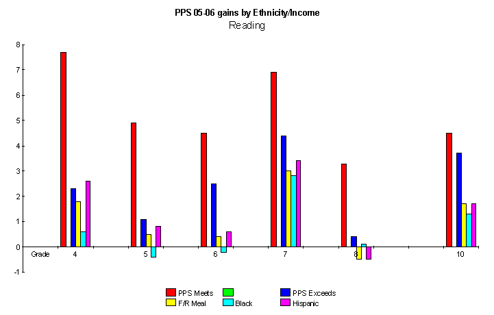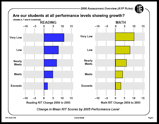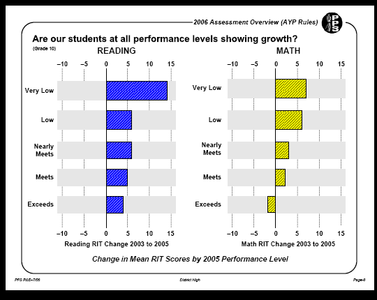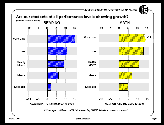 1) Charts of student gains in math and reading, elementary, middle and high school, 2005-6, by ability level, taken from the PPS AYP report http://www.pps.k12.or.us/depts-c/rne/results/2006/index.php?school=