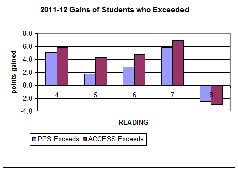 I was curious to see whether the testing ceiling was in fact making it impossible for high-achieving students to make gains, so I compared the gains made by ACCESS students with those of other students in Portland who "exceeded" benchmarks. ACCESS admits students in the top 1% of achievement--if there was a ceiling they should be hitting it harder than other students. They might have higher scores to begin with, but they would not have higher gains. If, on the other hand, the difference is a reflection of real differences in instruction, then ACCESS students might continue to outperform other students in PPS who also exceeded benchmarks.