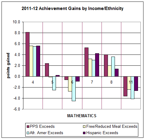 score from both 2010-11 and 2011-12. The data for "gains" subtracts student achievement test scores for each student in 2010 from the achievement test score for the same student in 2011 except in the case of eleventh-grade gains. As there is no ninth or tenth grade test, the scores of students from 2008, when they were in the eighth grade, are subtracted from their scores for 2011 when they were in the eleventh grade. Students taking the test are grouped by ability in five groups: "Very Low, Low, Nearly Meets, Meets, and Exceeds."The first column shows the average gain from one year to the next for all Portland students who exceeded the benchmarks. The following columns show score gains for Free and Reduced Lunch, African-American, and Hispanic American students who exceeded benchmarks in the previous year's test.