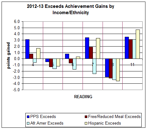 score from both 2011-12 and 2012-13. The data for "gains" subtracts student achievement test scores for each student in 2012 from the achievement test score for the same student in 2013 except in the case of eleventh-grade gains. As there is no ninth or tenth grade test, the scores of students from 2009-10, when they were in the eighth grade, are subtracted from their scores for 2013 when they were in the eleventh grade. Students taking the test are grouped by ability in five groups: "Very Low, Low, Nearly Meets, Meets, and Exceeds."The first column shows the average gain from one year to the next for all Portland students who exceeded the benchmarks. The following columns show score gains for Free and Reduced Lunch, African-American, and Hispanic American students who exceeded benchmarks in the previous year's test.