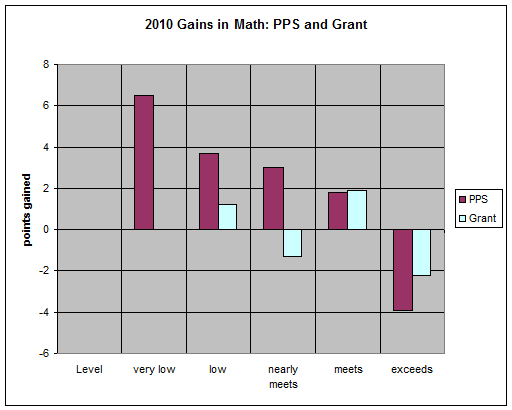 The math story is more complicated: students who "met" and "exceeded" did better at Grant than in PPS; students who were below the "meets" cut-off did worse.